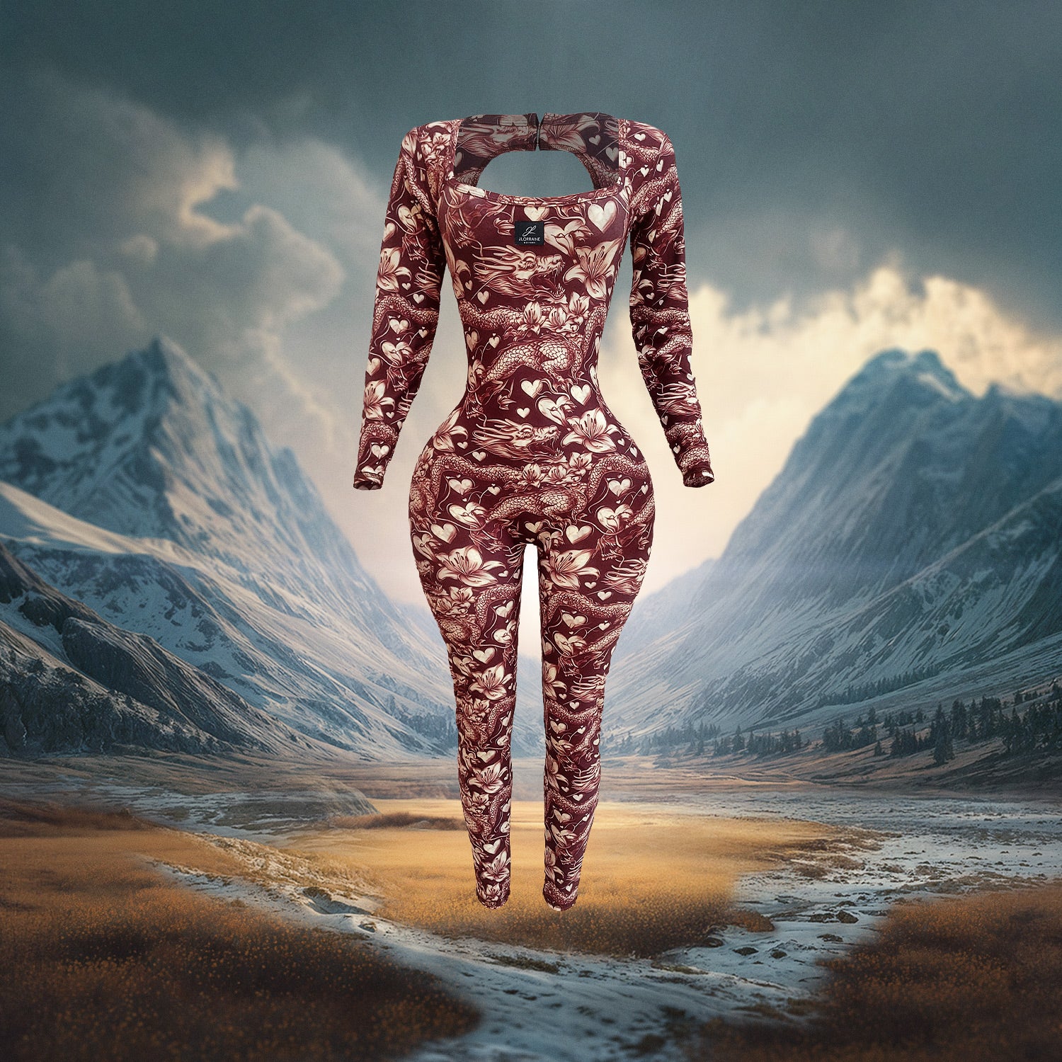 Burgundy base with blush pink dragons, florals, and hearts scattered throughout. This printed jumpsuit for women brings romance and edge to your wardrobe in one bold pattern.