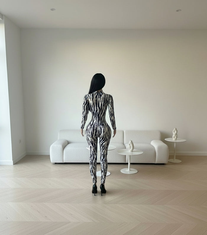 Zora Jumpsuit – Black & White Zebra Print Bodycon One-Piece