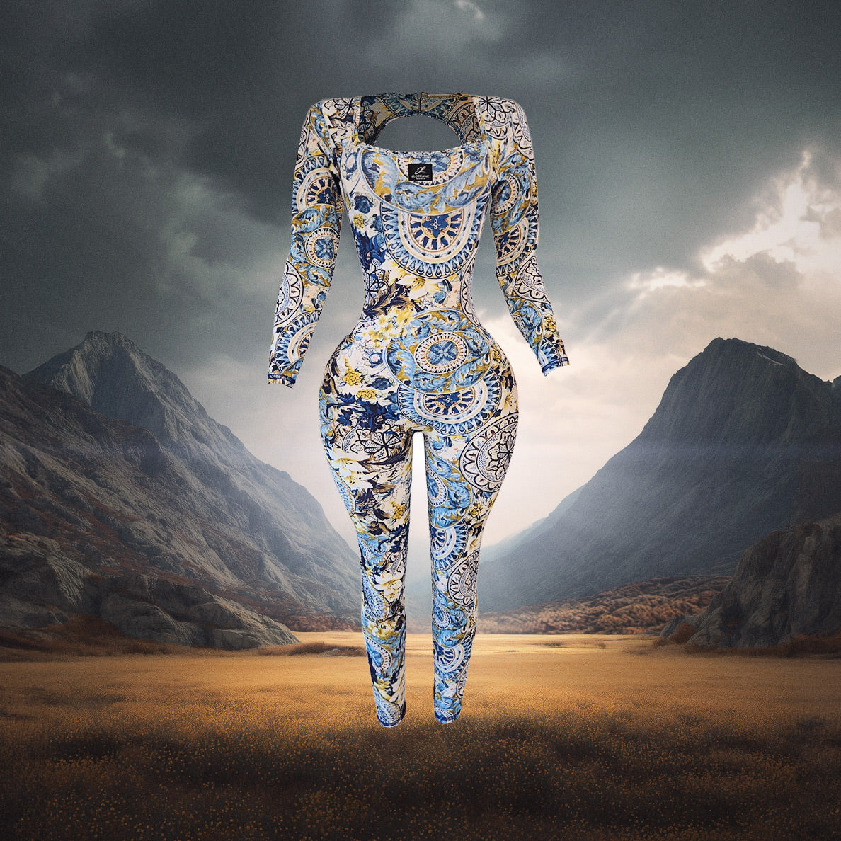 Sabrina Jumpsuit made for movement and night-out versatility, this backless jumpsuit pairs a striking blue print silhouette with strategic cutout detailing that commands attention.