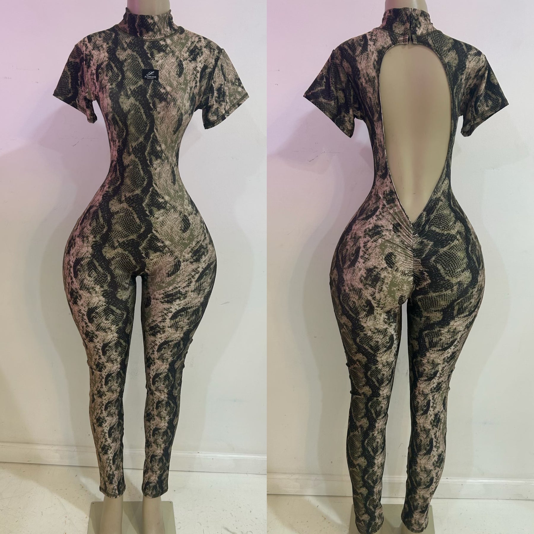 Jungle Jumpsuit 2.0 – Snakeskin Print Mock Neck Open Back One-Piece