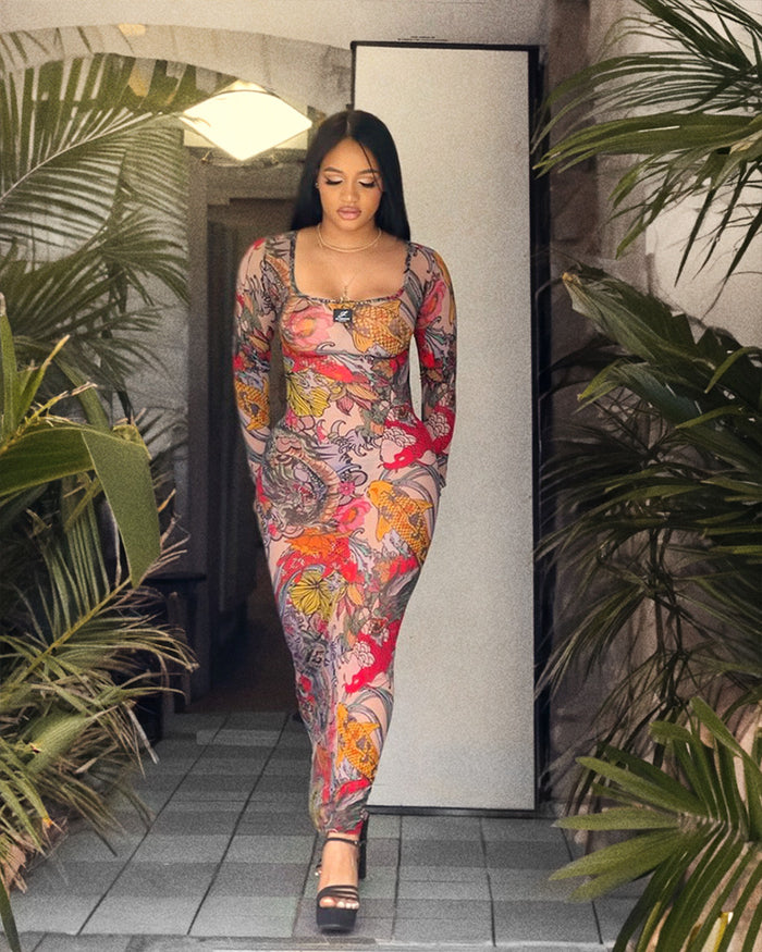 Step into elegance with the Coi Dress, a stunning one-piece maxi that effortlessly combines sophistication with a touch of exotic allure. Designed to captivate, this dress features the same captivating Japanese-inspired art as its jumpsuit counterparts, with intricate koi fish and delicate blossoms adorning the flowing fabric.